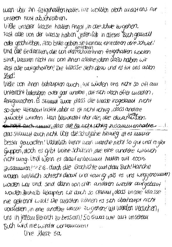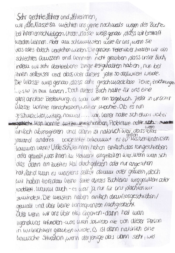wir, die Klasse 8a möchten uns geren nochmals wegen des Buches bei ihnen entschuldigen. Unsere Klasse weiß genau, dass wir bestraft werden können. Aber am Schlimmsten wäre für uns, wenn sie alles falsch verstehen würden. Die ganzen Ferien über hatten wir ein schlechtes Gewissen und konnten nicht glauben, dass unser Buch, indem wir übertriebene Dinge festgehalten haben, nun bei ihnen selbst sei und das über dieses jetzt so diskutiert werde.
